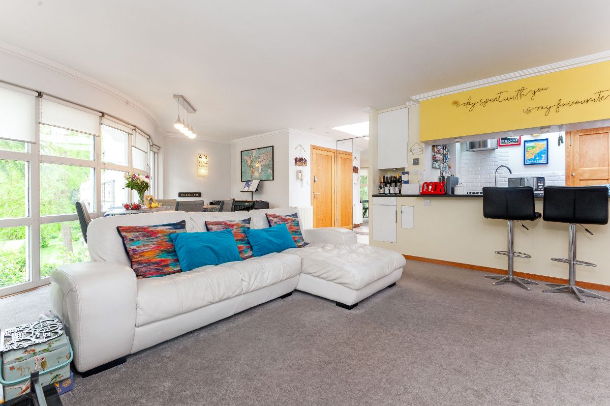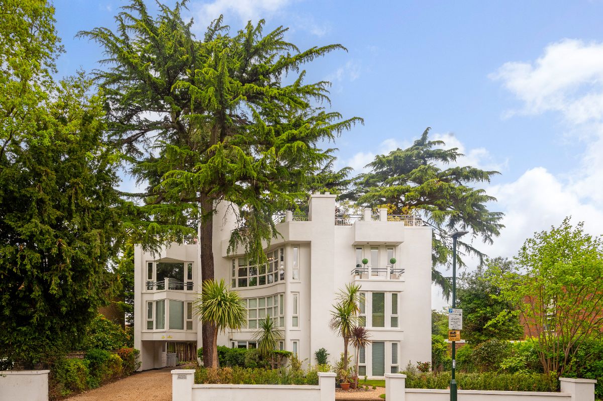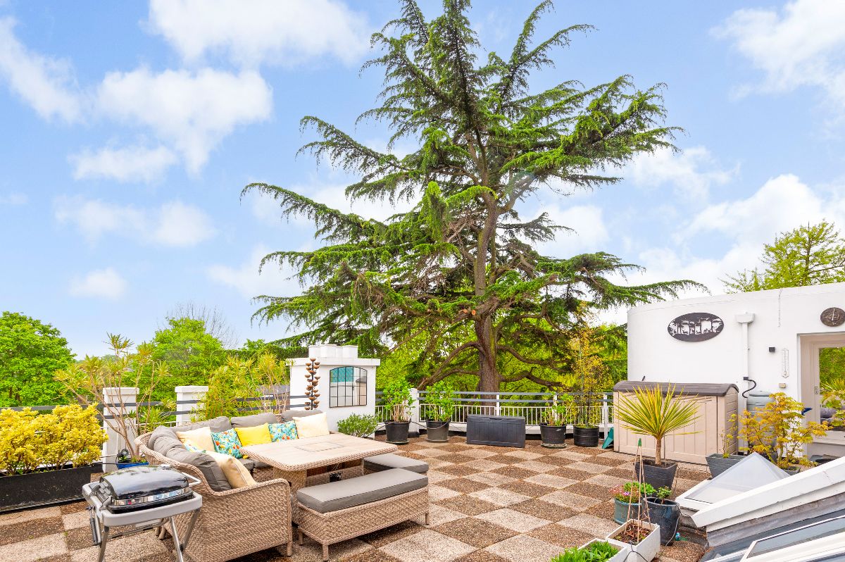 Architectural designed around gardens of mature Cedar and Redwood trees this stylish and considered development of just seven apartments really is one to be seen! Well-maintained communal entrance and staircase leads to the top floor and access into the very special Flat No.7. A welcoming entrance area has space for coats and shoes to be neatly tucked away before entering into the show stopping open plan reception room. Exceptionally bright and spacious, you are immediately drawn to curved floor to ceiling windows and treetop views. The adjoining modern kitchen with breakfast bar is well equipped with all the mod cons and large sky lights which illuminate the space with natural light. The living space is stylish and relaxing with a warm and unmistakable homely air, whilst the master bedroom boasts a lovely en-suite shower room and ample fitted wardrobe space, the second double bedroom is well served by a separate full bathroom suite.