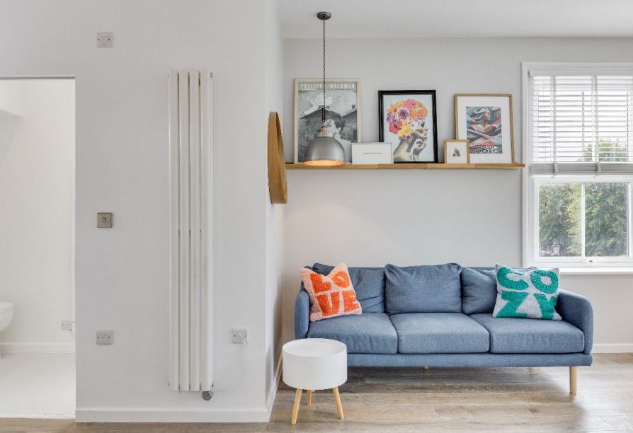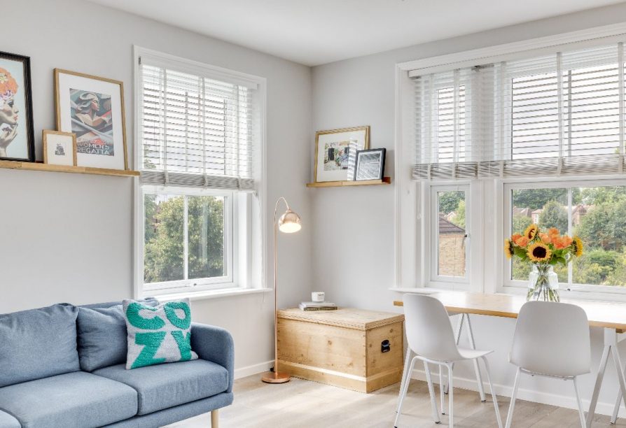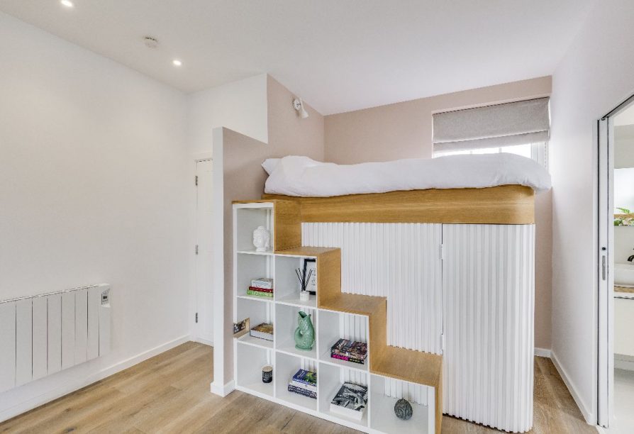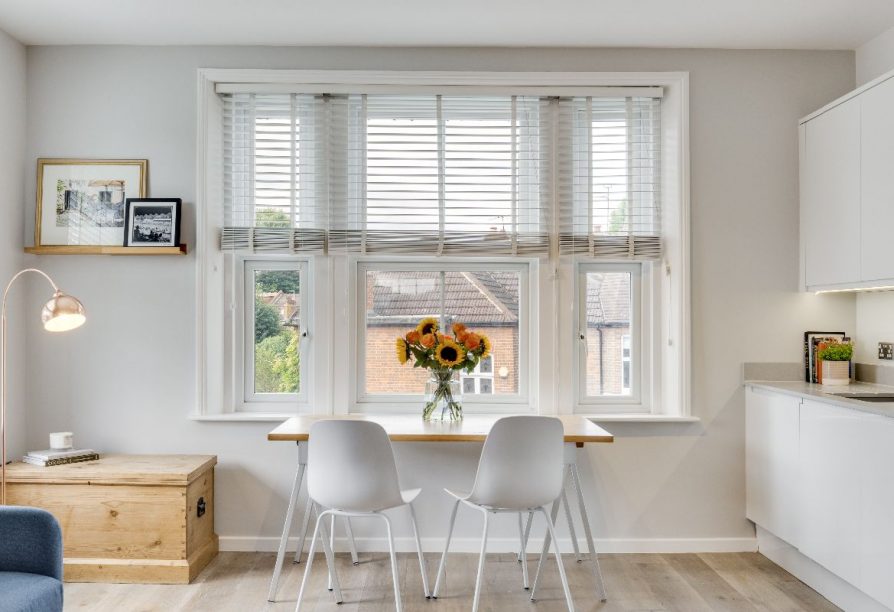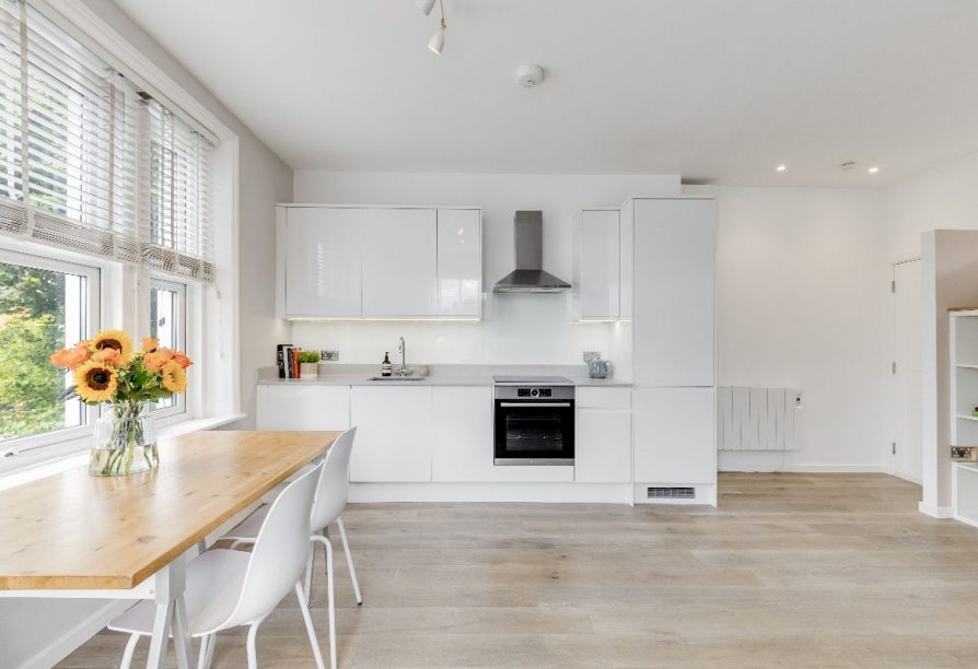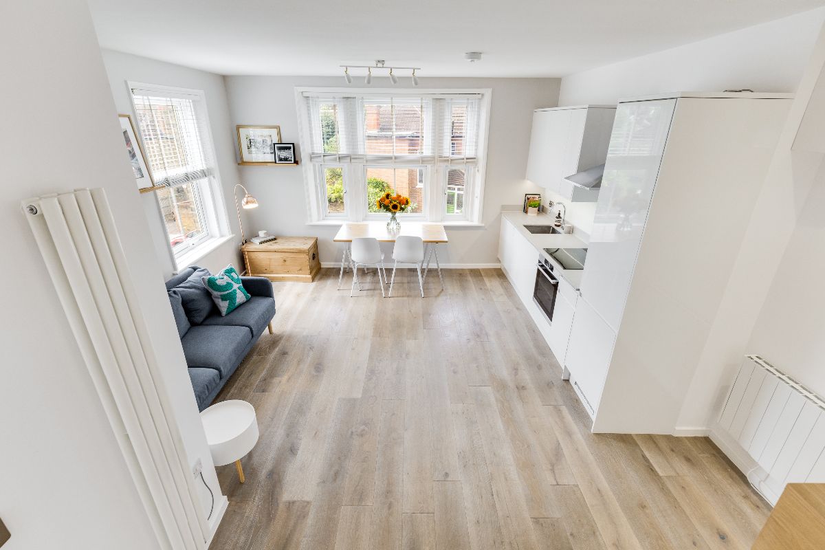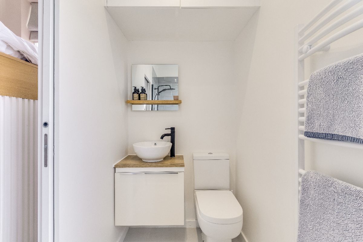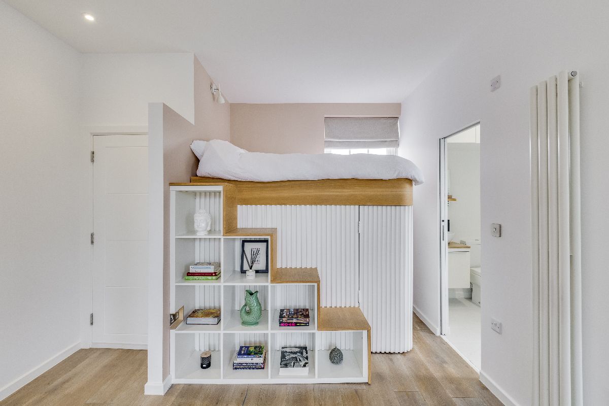 The flat is approached via communal stairs to a stylish dual aspect reception room and open plan kitchen area with high ceilings, engineered oak flooring and a very generous range of units, granite worksurfaces and integrated appliances provide a wonderful space to cook. The bathroom is of particular note, sitting adjacent to the bespoke mezzanine sleeping area with fitted storage under. Set within a well-maintained period building, the property's elevated position makes it an especially peaceful and light and cohesive living space with clean Scandinavian influenced tones and lovely local views.