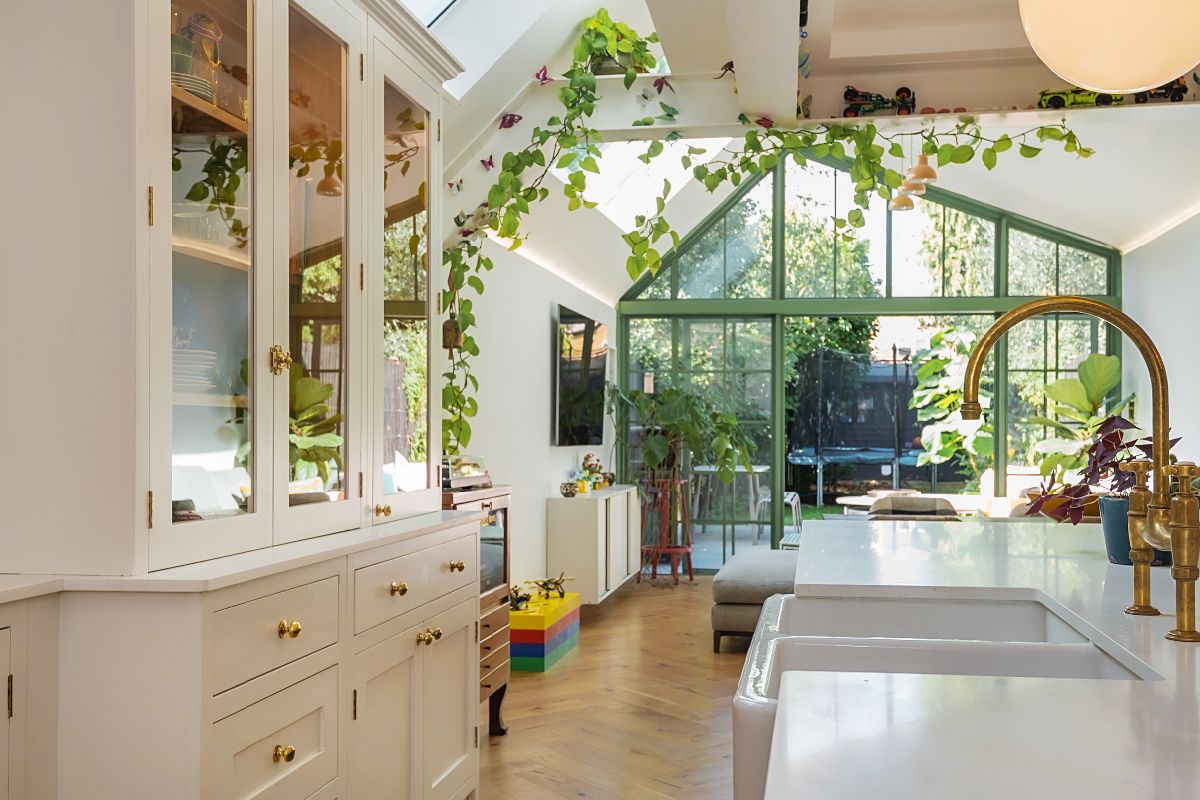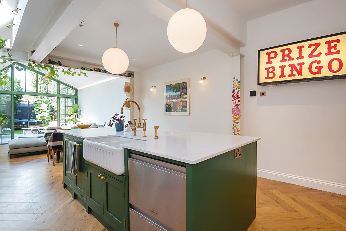 This truly remarkable house has a real depth of quality, full of refined bespoke detail, architecturally on point delivering a family home of exquisite taste. Centred around a spacious light filled kitchen/dining family room, defined by the most incredible Crittall and glazed extension, effortlessly blending the dining and family space with the beautiful south west facing garden, whilst the kitchen itself is a generous range of high-quality base and wall cabinets alongside modern integrated appliances . The bay fronted reception room provides more living space finished with wood floors, cast iron fireplace and plantation shutters, and the boldly decorated, welcoming entrance hall turned cloakroom has been cleverly opened, creating a space where coats and wellies can be hidden neatly out of eyesight.