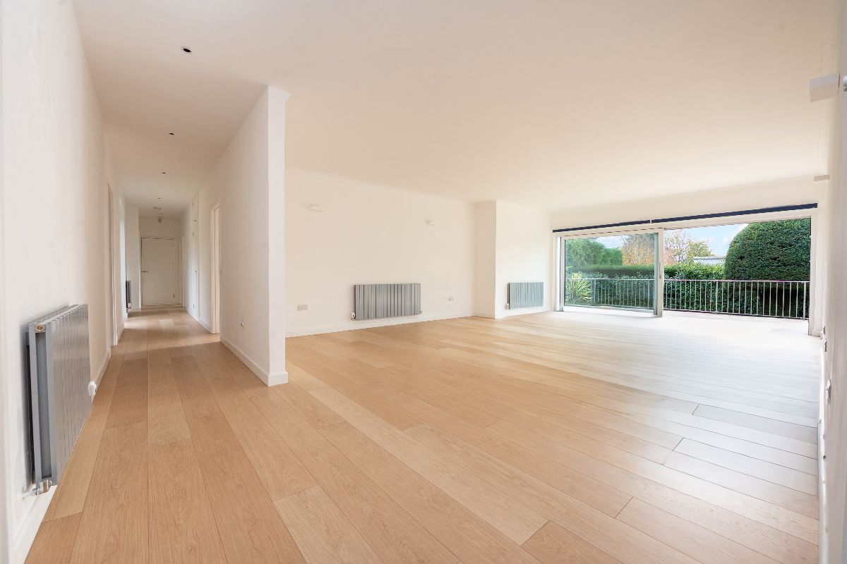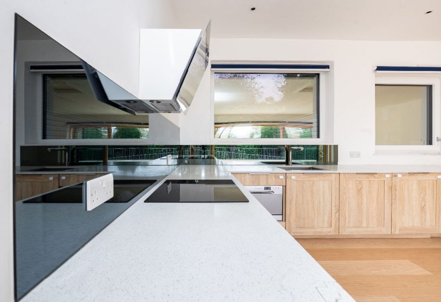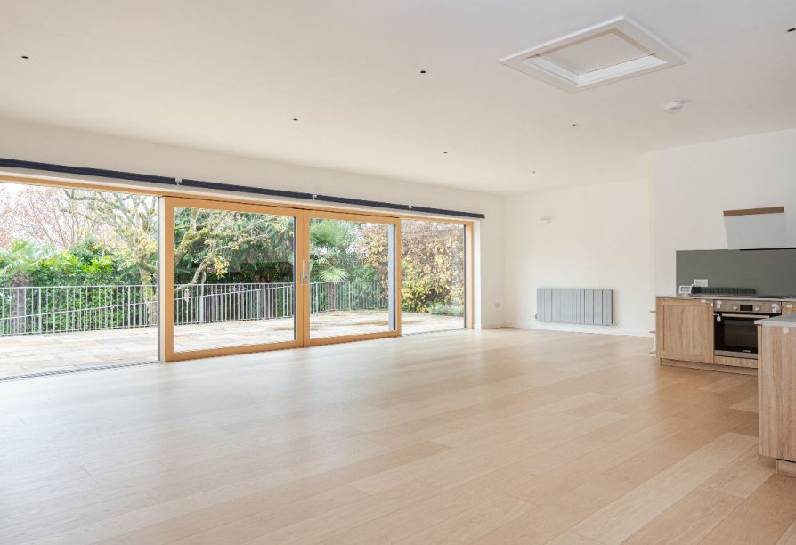 Once inside, the property offers open plan lateral living of exquisite taste, with what we can only describe as ''simply cavernous' dining and entertaining space sitting seamlessly alongside the kitchen which is thoughtfully designed and fitted with a range of high specification integrated appliances. For the purpose of privacy, the windows facing the front also include 'one way glass'. A strikingly beautiful range of triple glazed sliding doors provide lush garden views across across the entire rear aspect of both reception areas and lead to the elevated Indian Sandstone terrace, offering an outdoor entertainment area and step free access onto the lower lawn where mature trees and shrubs offer total privacy in all seasons.
