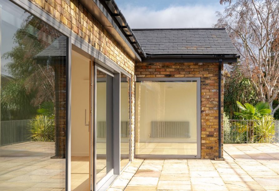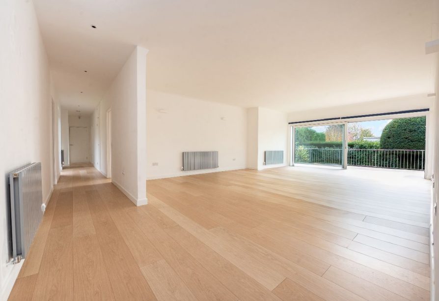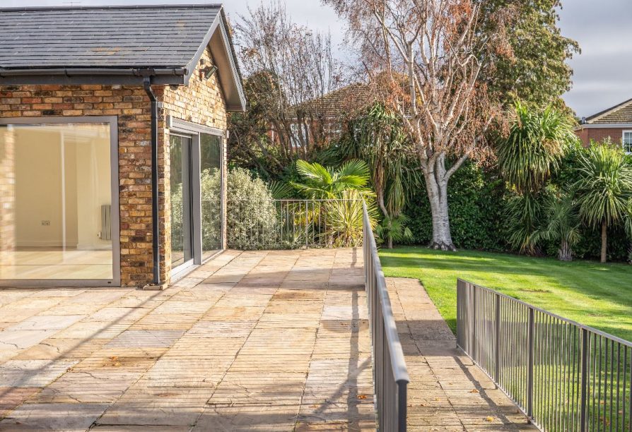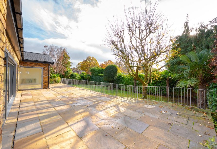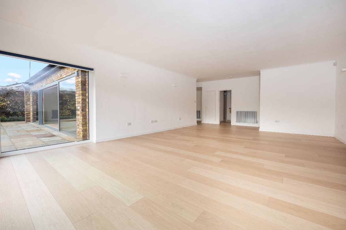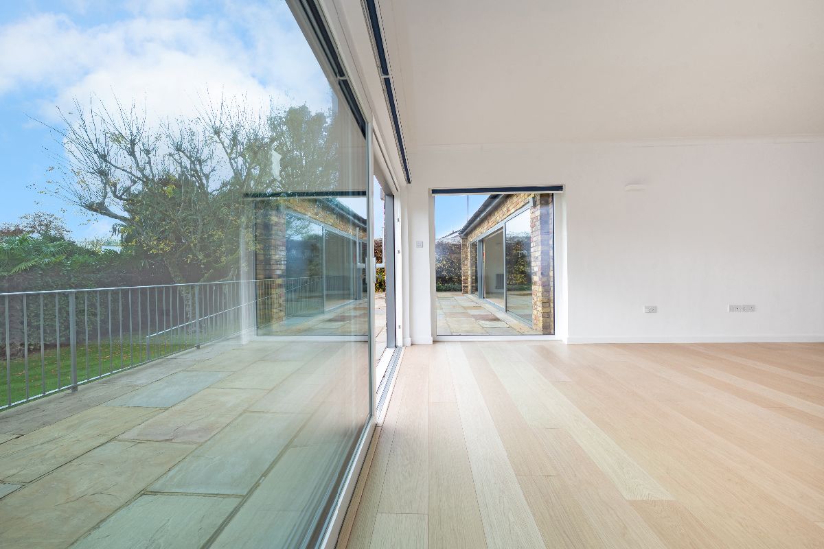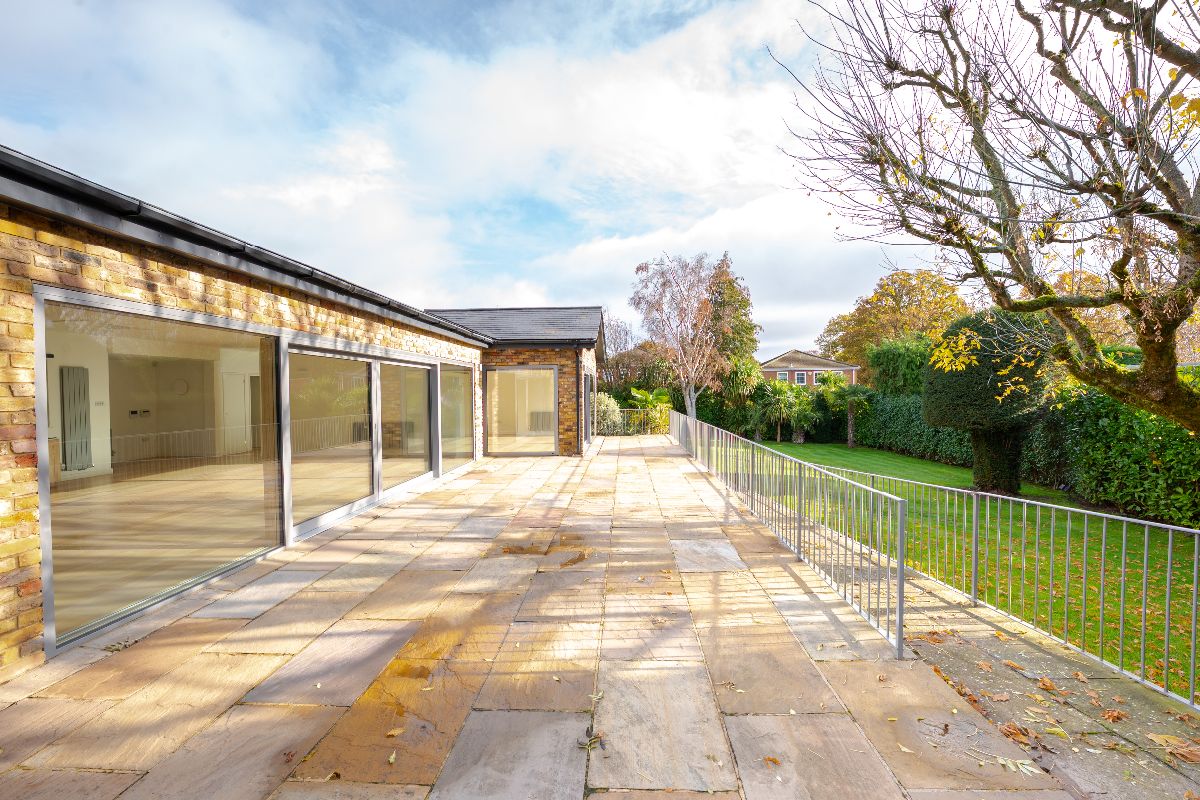 Once inside, the property offers open plan lateral living of exquisite taste, with what we can only describe as ''simply cavernous' dining and entertaining space sitting seamlessly alongside the kitchen which is thoughtfully designed and fitted with a range of high specification integrated appliances. For the purpose of privacy, the windows facing the front also include 'one way glass'. A strikingly beautiful range of triple glazed sliding doors provide lush garden views across across the entire rear aspect of both reception areas and lead to the elevated Indian Sandstone terrace, offering an outdoor entertainment area and step free access onto the lower lawn where mature trees and shrubs offer total privacy in all seasons.