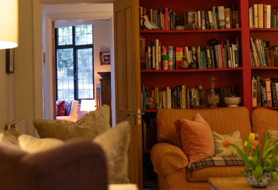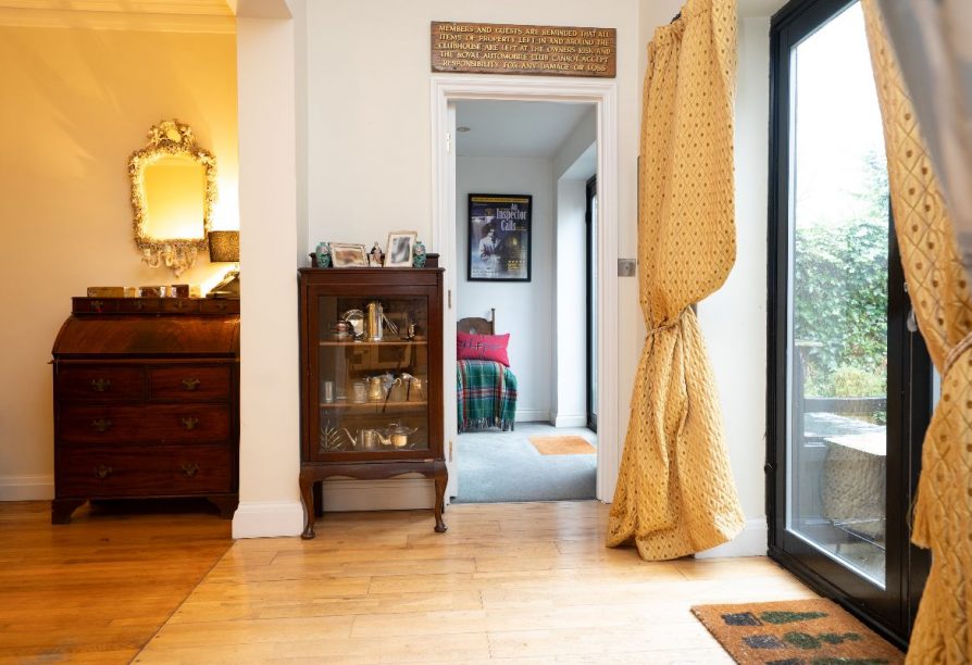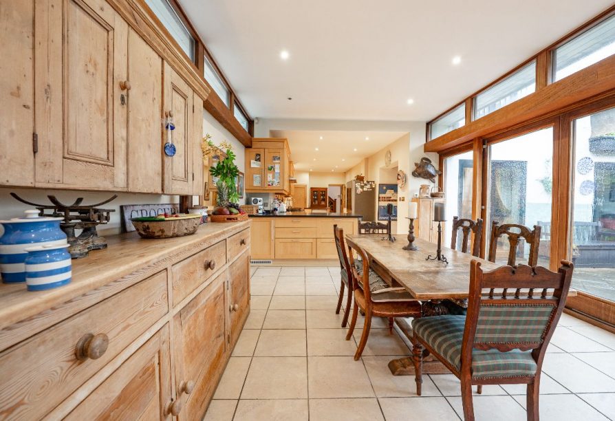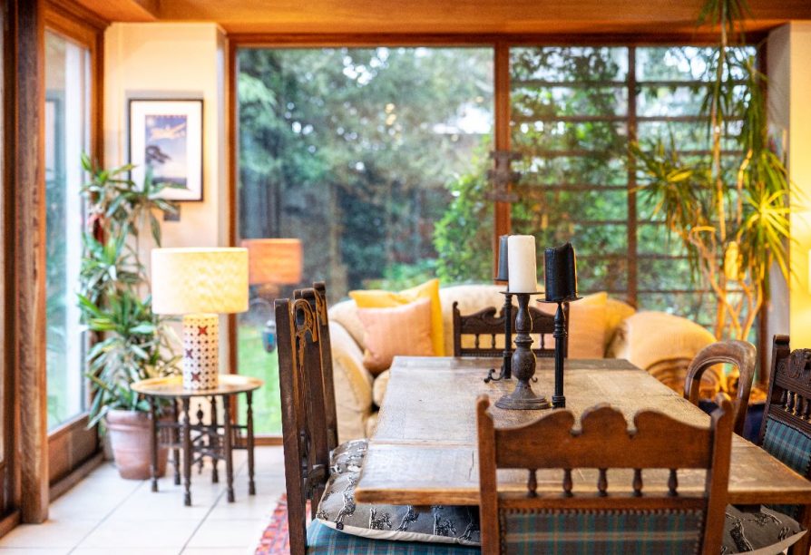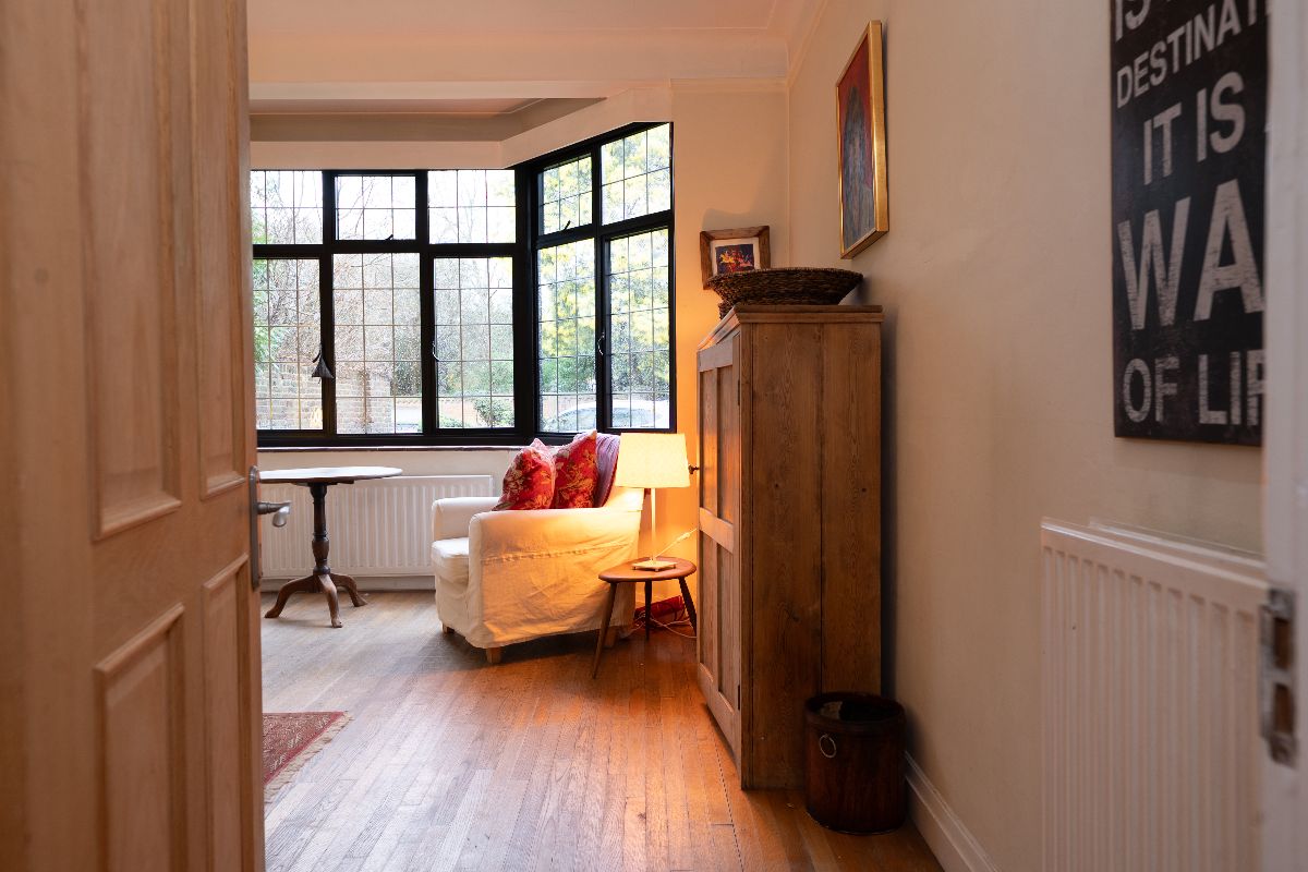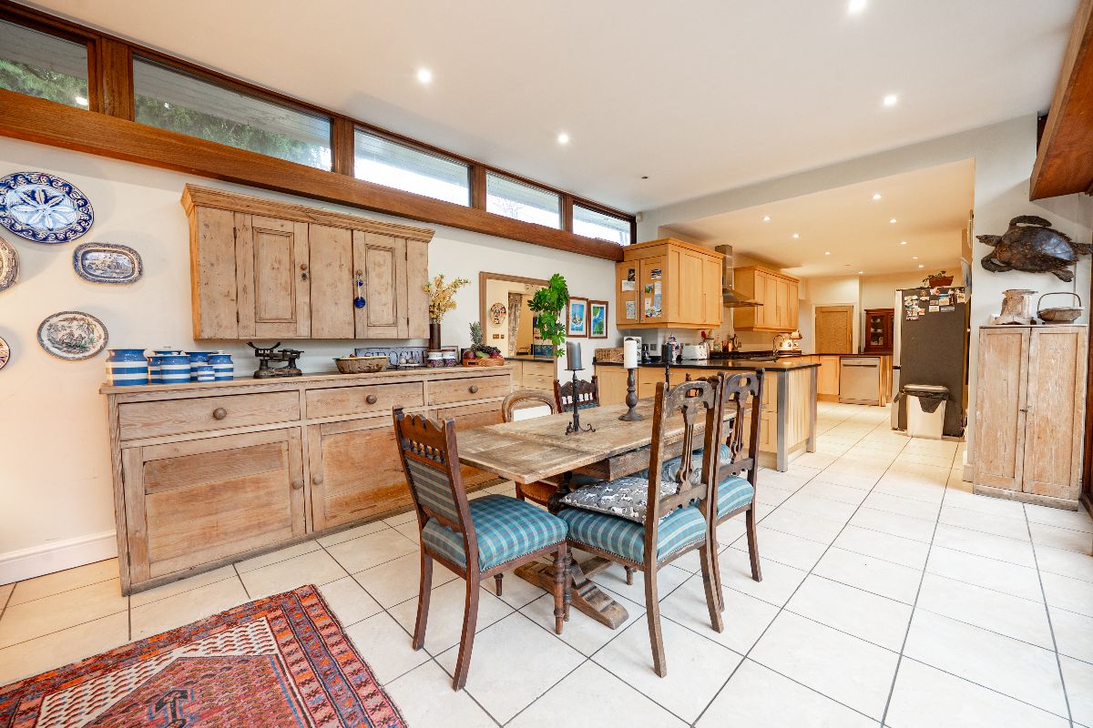 With soft neutral tones running throughout, the house has been much loved and well maintained by the current owners, with modern refinements such as new windows already in place, there remains the opportunity for some gentle updating. The warm and welcoming family friendly entrance hall leads to a spacious drawing room that could be used as a more intimate sitting room, a principle double reception room with anchoring open fireplace, which in turn leads into the private study panelled with bookshelves and built in storage. To the rear of the house, a well-appointed family kitchen and dining room provides the hub of the home, the latter being a wonderfully light and strikingly beautiful mid-century inspired extension is the crowning glory to the living space. A large (very dog friendly) utility room and cloakroom complete the ground floor accommodation.